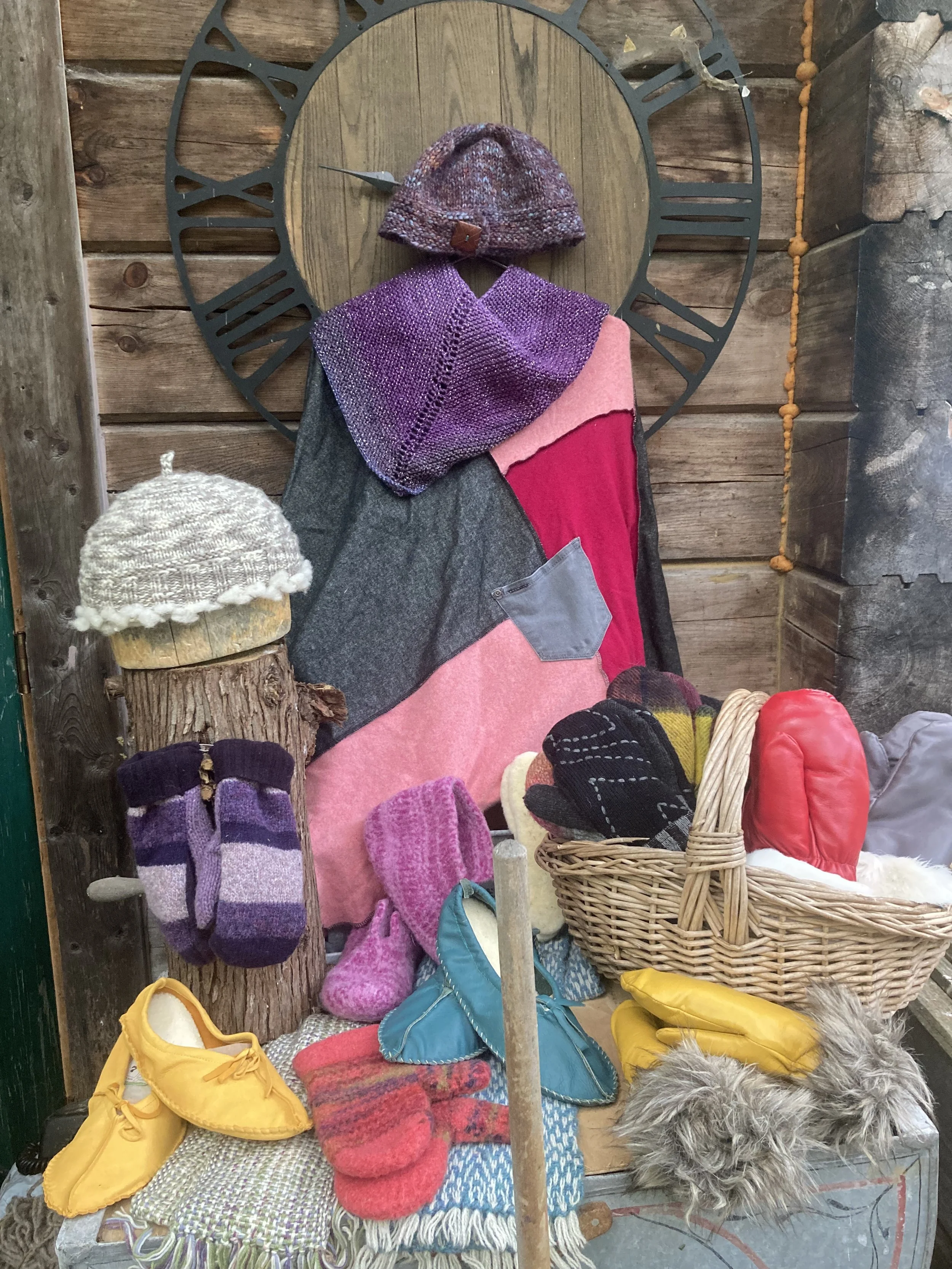 Knitted wool sweaters, hats and mitts, originally designed handmade/ upcycled clothing and accessories.Woven wraps. Leather moccasins